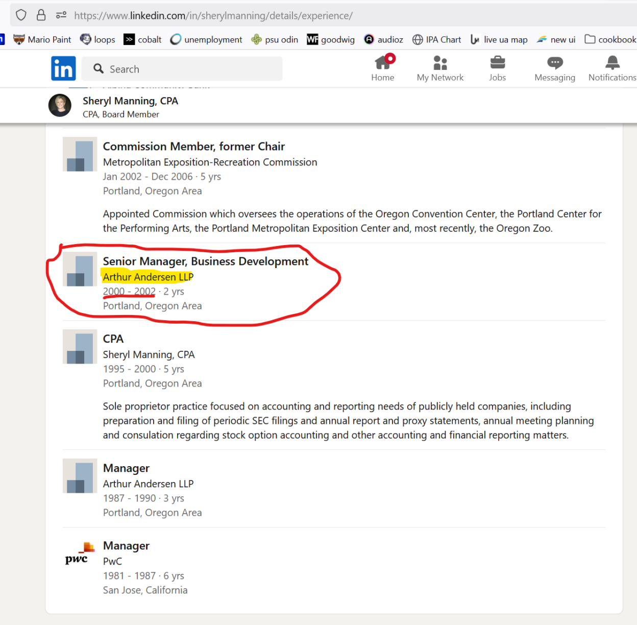 Arthur Anderson's connections to Enron, and subsequent collapse following the Enron Scandal, are well documented in the book "Final Accounting: Ambition, Greed, and the Fall of Arthur Anderson." by Toffler and Reingold.  There can be no doubt about her complicity in the scandal seeing as her Linkedin profile clearly lists her as working of Arthur Anderson from 2000-2002, and the Enron Scandal went public in 2001.